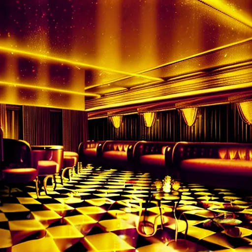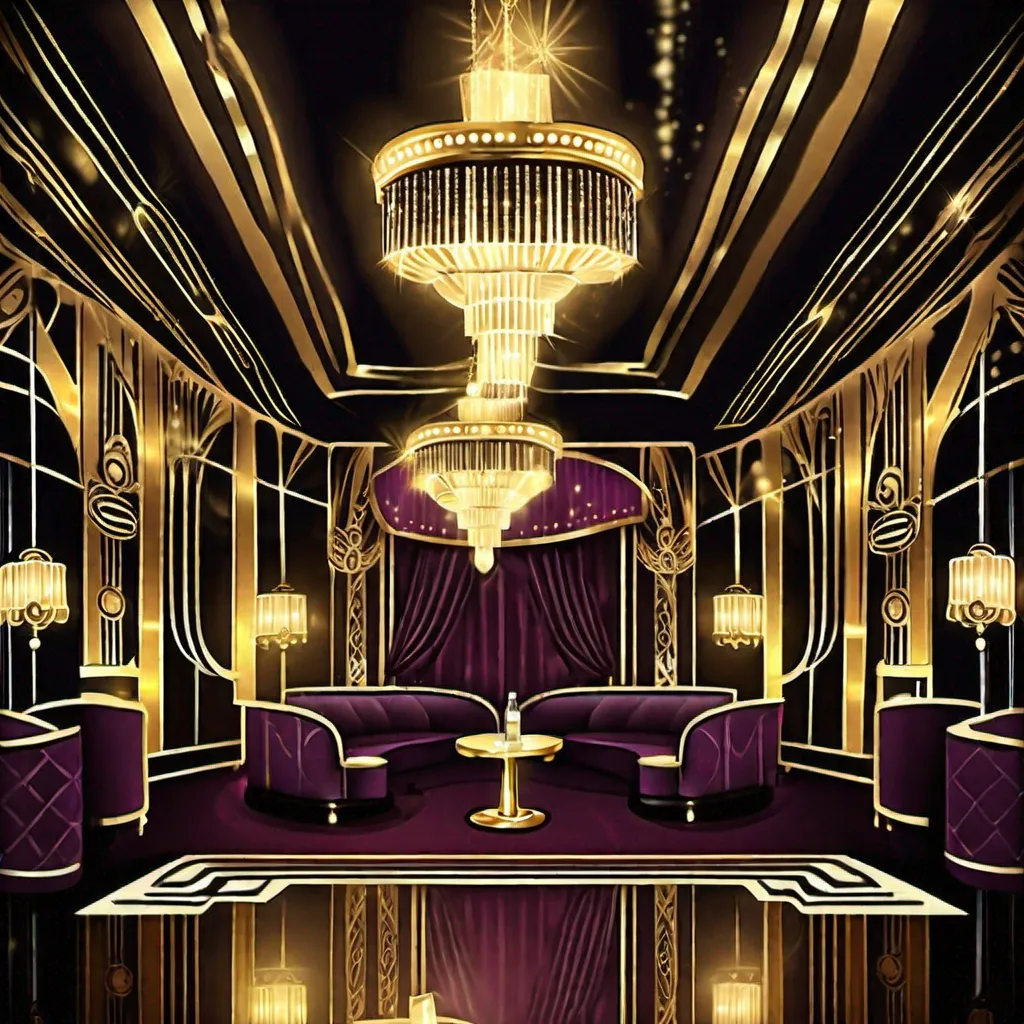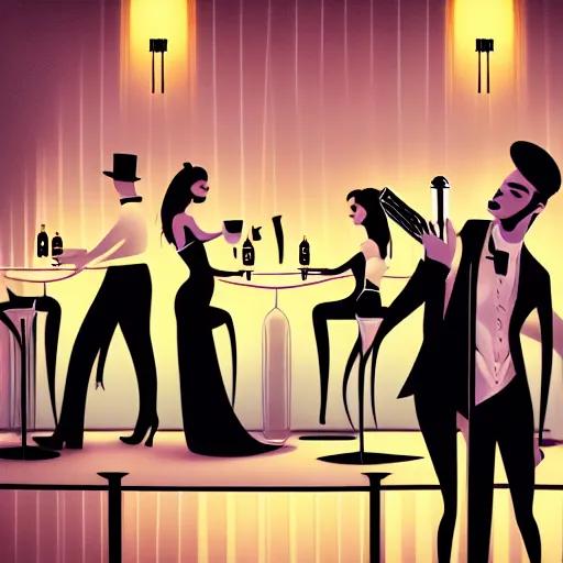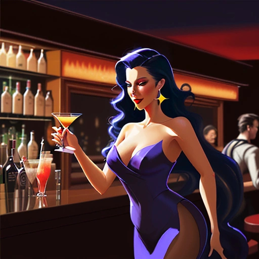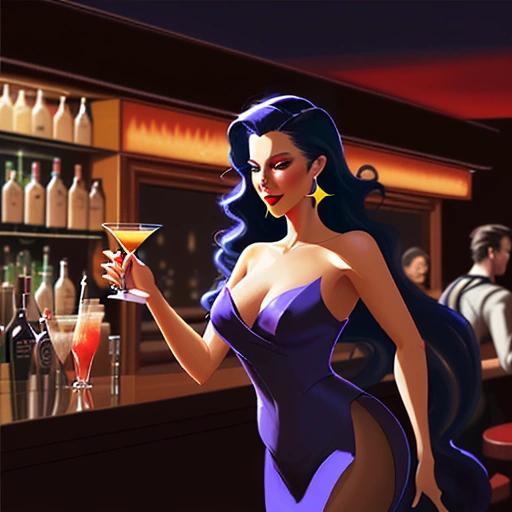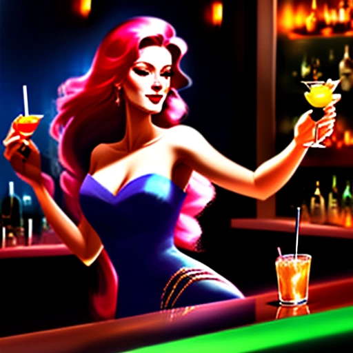 In this sophisticated digital painting, the concept art unfolds a captivating tableau of an online-bar steeped in midnight hues. Swirling at the heart of the image, a jazz singer becomes the embodiment of elegance and allure. The feminine figure, awash in the soft glow of muted neon lights dances with intoxicating energy in the cosy bar. Fashioned with a regime of meticulous strokes and vivid colours, her long hair cascades like a waterfall, portraying a symphony of movement. Illuminated in the sharp focus of the scene, her ostentatious dress shimmers, each thread painted with a fine deliberation that screams of extravagance. Wraiths of music notes, rising from an unseen source, weave an atmosphere of classic jazz immersion. Their phantasmal existence plays in harmony with the bar's rhythmic pulsations, drenching the corners of the image in a palpable sonic texture. In the periphery, revellers, painted as blurred silhouettes, move to the beat, their blurred outlines indicating dynamic motion. Beneath the glided chandelier, the polished sheen of the bar counter offers an array of mesmerising drinks. A celestial gradient of liquid colours dances in the glasses, reflecting tones from honey amber to ocean blue, each glass capturing the warm incandescence with remarkable realism. Against a saccharine selection of elixirs, the smooth glass bodies gleam like modern sculptures, the effervescence captured in frozen carbonated trails as admirable as shooting stars. Meanwhile, in the background, ensconced under a panel of glass, a colourful mosaic of city life oozes a nocturnal charm. The observer gets the glimpse of a bustling city nightlife, a composition of twinkling skyscrapers etched against the skyline. The skyscrapers' glowing panorama plays in contrast with the intimate conviviality of the indoor bar scene, adding spectacular depth and dimension to the digital canvas. This illustration, strategically woven with elements of dynamism, old-world glamour, and artistic expression, brings a bustling late-night cocktail bar to life, blurring the borders between the tactile and the digital with virtuosic precision.