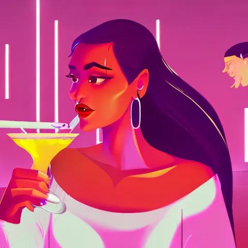 The digital painting captures the spectacle of an enchanting late-night cocktail bar, steeped in a poised reverie of elegance and sophistication. The masterpiece trembles on the brink of reality with its sharp focus, capturing each detail with explicit precision. At the epicentre, a Jazz Singer dances, resplendent in her splendour, complementing the jovial ambience of the bar. Her visage is the epitome of elegance, radiating unadulterated poise. Bedecked in a glittering gown, her effervescent charm illuminates the establishment. She has tumbling waves of long, glossy hair that fall fluidly down her back, creating a contrast with the nocturnal scene. Her movements, caught mid-twirl, are portrayed with an ethereal smoothness that evokes a sense of allure and fascination. The artist's expert manipulation of digital brushstrokes lends an impressive fluidity to her movements, as though she is caught in a mesmerising dance with the rhythm of the Jazz notes themselves. Under an ornate glass dome in the background, a colourful array of drinks is meticulously lined up, bathed in a soft, inviting glow. The sparkling glasses hold a myriad of spirits and potions, all ready to delight the palate of the bar's esteemed patrons. These pint-sized celebrities, ranging from icy martinis to cherry-topped cocktails, are perfectly presented with tempting allure. Framing the entire scene, a symphony of revellers can be seen in their dance, their silhouettes blurring and merging into each other in a whirl of jubilant energy. These onlookers lend the image a contagious energy, creating a bustling contrast to the ice-cool serenity of the cocktails under the glass. The image, a clash of sharp and dreamy, is a celebration of the nightlife and its enchanting allure, every element carefully balancing on a knife-edge of anticipation. This concept art becomes a tangible illustration, its very essence wrapping the viewer in a cocoon of vibrant nightlife euphoria.
