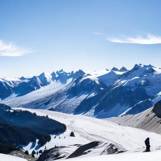 This vivid image captures the undulating grandeur of snow-capped peaks in the Alps. As a dominating force occupying the majority of the frame, a gargantuan mountain appears swathed in a pristine blanket of freshly fallen snow. Its peak thrusts dramatically into a steely blue sky, imbued with the cold intensity typical of a high altitude environment. The mountain's slopes slalom downwards, composed of innumerable ridges and crevices, all of which dance with the shadows cast by the shifting sun. The snow covering these gorgeous contours catches the light capriciously, creating an ethereal light show of blues, whites, and glittering silvers. In several places, jagged rockfaces jut out, their obsidian-hued starkness offering a marked contrast against the surrounding whiteness. Emanating from the mountain's side, a few revelling tendrils of morning mist can be seen gently dissolving into the nippy alpine air. Their diffuse quality adds a sense of mystery and surreality to the scene. In the rugged foreground, verdant pines interspersed with patches of stubborn snow dot the landscape, showcasing the resilience of nature in such harsh environments. A murmuration of birds, insignificantly small against the sinewy backdrop of the Alps, can be seen in flight, their silhouettes dashing across the sapphire sky. In the farthest reaches of the breathtaking vista, several other mountains hunch in geometric perfection, their distant blue-grey forms fading out into the chilly haze. The overall effect is one of awe-inspiring intensity, portraying the power, beauty, and dramatic allure of the Alpine mountains ensconced in their winter finery.