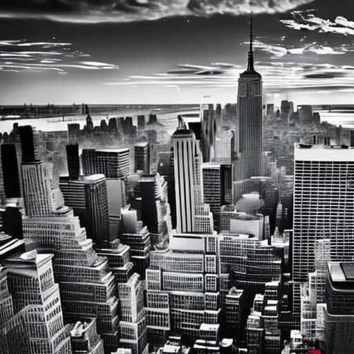 This captivating image presents the iconic skyline of New York City in a panorama of architectural grandeur. The towering edifices float against the cerulean horizon, their myriad windows reflecting the incandescent glow of the setting sun in a harmonious ballet of light and shadow. Prominent amongst these structures is the formidable silhouette of the Empire State Building, its stately prow dominating the urban seascape with an assertion of dominance, while the tall, slender form of the One World Trade Centre pierces the sapphire sky, a definitive monolith of glass and steel. The swelling mass of concrete structures, punctuated by pockets of verdant greenery, taper into the misty distance, leading the viewer's gaze towards the tranquillity of the Hudson River. The river, a serpentine ribbon of obsidian, cuts a swathe through the cityscape, reflecting the luminescence of the city lights in its dark, rippling waters, while the crisscrossing beams of the Brooklyn Bridge create a lacework of steel against the twilight. Looking at the cloud-kissed skyline, one can see the fiery fingers of the sunset painting the heavens with broad strokes of orange, crimson and gold, casting an almost ethereal glow over the city. The play of the dying sunlight and nascent city lights creates a spectacular chiaroscuro effect, marking the transition from bustling day to vibrant nightlife. This image pulsates with the energy and dynamism of the city that never sleeps, rendering a palpable depiction of New York's indomitable spirit. A visual feast of architectural innovation and urban resilience, it perfectly encapsulates the essence of this metropolis, embodying its dazzling diversity, virile vitality and ceaseless charisma in one sweeping view.