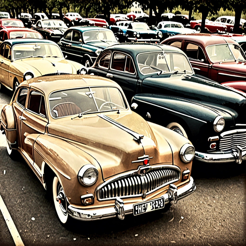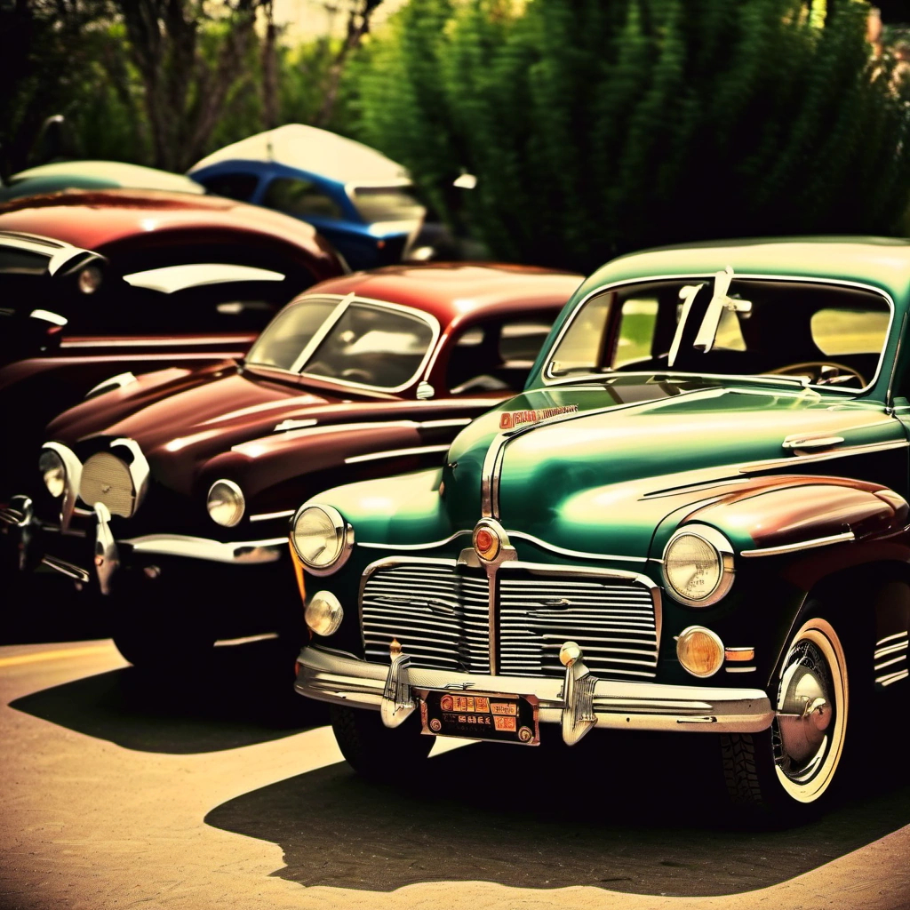 In the image, a visually captivating ensemble of vintage automobiles graces the mise-en-scene; their sleek silhouettes, weathered by antiquity yet retaining an undeniable charm, stand out prominently against an iridescent backdrop of a twilight blue sky stippled with radiant starlight. In the foreground, a gleaming 1940's Bentley dominates the space with its signature robust structure. Its deep royal blue paintwork is visibly threadbare, revealing an enticing patina, a testament to its historical past. The round, crystal-like headlights punctuate the car's presence, their age-old brilliance undimmed. Chrome bumpers and wing mirrors reflect the ethereal shifting hues of the setting sun, merging the timeless craft of vintage with the beauty of the natural world. Behind it, a resplendent line-up of period vehicles stretches out, hailing from eras marked by distinct automotive ingenuity. These include an emerald-green Ford Model T, its delicate spokes a relic from bygone times, and a candy apple red 1950's Chevrolet, with its audacious tailfins that seems to be ready to take flight. A gossamer light from antique lamp posts washes over these mechanical marvels, making their polished surfaces shimmer whilst highlighting the intricate detailing, from the chrome hood ornaments to the leather upholstery visible within. Cobbled stones underfoot add a tactile dimension to an already multi-layered spectacle. This image is a throbbing tribute to a time when man and machine intermingled seamlessly, basking in the allure of vintage nostalgia, revelling in the forgotten magic of yesteryears, and pining for an era when cars were more than mere machines—they were labour-intensive works of art. It's an idyllic symphony of chrome, style and elegance that effortlessly blurs the line between the utilitarian and the extraordinary.